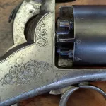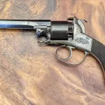 This is a gorgeous British Bentley Webley revolver in wood case and accessories like bullet mold, oil bottle, ramrod, powder flask, percussion cup tin etc. Revolver with beautiful fire blue finish on barrel, cylinder, screws and some other small parts. Receiver and trigger guard engraved. Barrel marked H. ALLPORT & SONS CORK. Timing and index work as it should. No rust, pitting or crack found. The powder flask and lock on the box need some repair. Bore has some corrosion but rifling still strong and shinning. I don’t know much about this revolver, will try my best to describe it. Please see photo album for details. Asking $4150 plus shipping.
