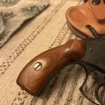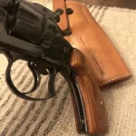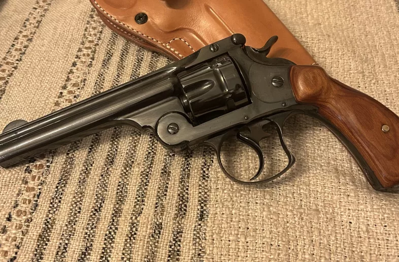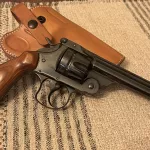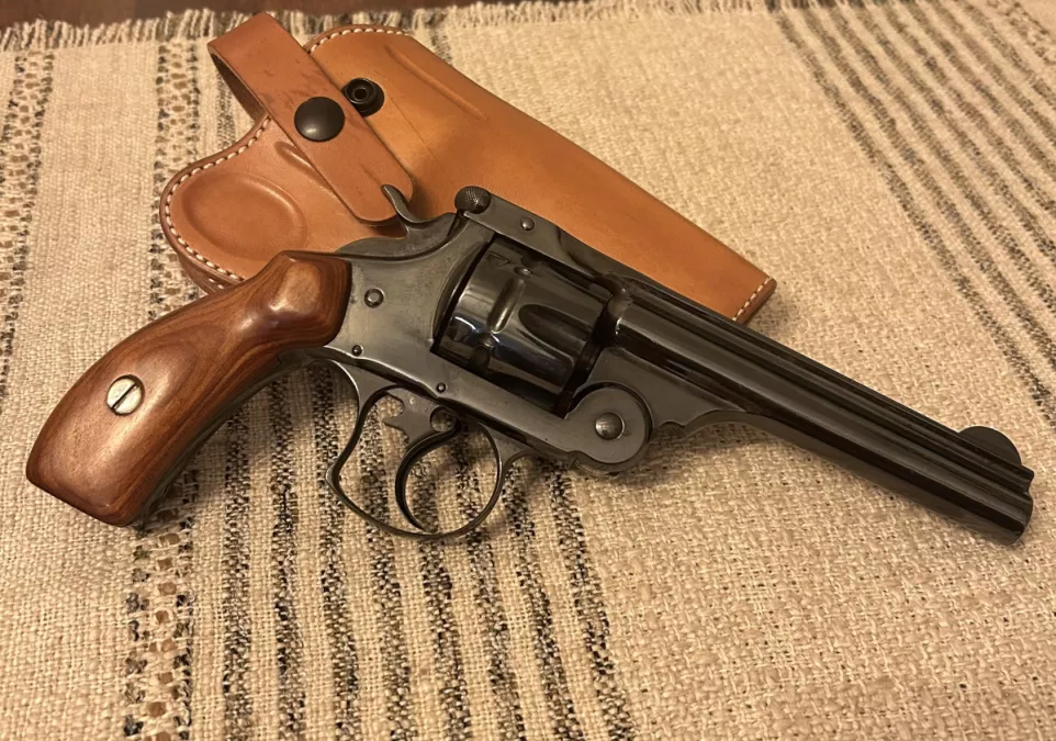 Smith and Wesson double action in 44 Russian calibre with a factory 5 inch barrel. This revolver is an excellent condition, the finish was restored at sometime in its life and comes a nice set of custom-made wood grips and a hand made Alaskan holster Custom fitted to this revolver. The action functions perfectly both in single and double action with excellent timing and lock up. This Antique also comes with RCMP, FRT document.