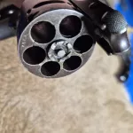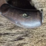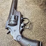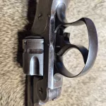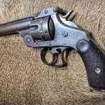Smith & Wesson No. 3 DA 44 Russian, 1st model. Early wood grips, low serial number. Gun is mechanically good, with slight play at the latch, not at the hinge. Nice patina with traces of original finish. Case colour on hammer.