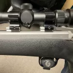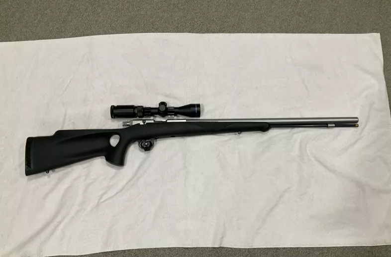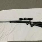 Knight MK-85 .54 cal muzzleloader with Scorpion variable scope. RH Synthetic thumb hole stock, stainless barrel. Also comes with .54 cal bullets and cleaning supplies. In Regina Shipping extra