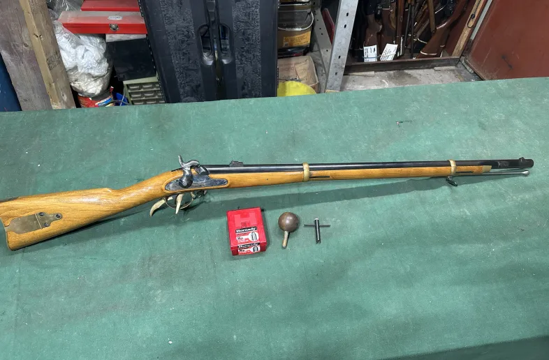 Antonio Zoli made in Italy 58 caliber percussion Pattern 58. Ram rod intact, 2 tier rear sight, comes with ball starter, nipple wrench, and a box of conicals. It’s in great shape, half cock safety, brass patch box and trim, sling swivels, bayonet lug intact. super show and shoot piece. Shipping available.