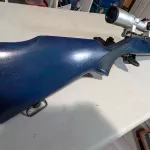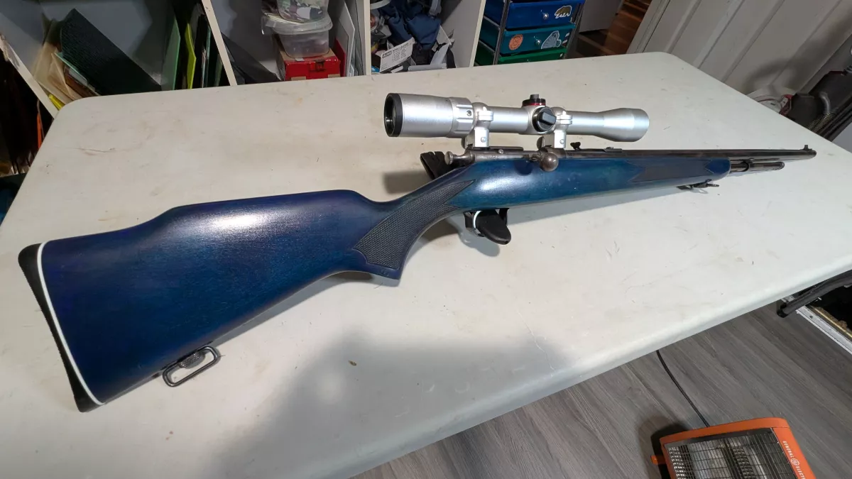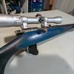 This has obviously been stained blue lol, it does look pretty cool but it could use a nice reblueing to look really sharp. The gun and scope are very accurate, it's a ton of fun everyone always enjoys shooting it! The little scope turret covers are missing but makes no difference for functionality.