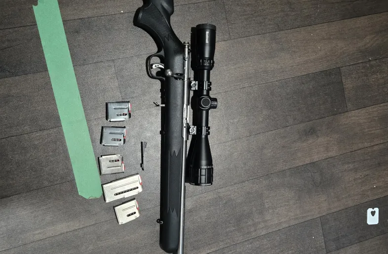I have a savage model 93 chambered in 22 mag. This is the synthetic stock stainless version with the fiber optic sights (rear sight taken off for scope but included) it will come with 5 magazines and a bushnell banner 2 4-12x40 scope. Gun is in great shape i have had this gun for a while and it has never let me down. Asking 600$ local preffered but shipping can be arranged on your dime