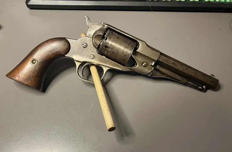 For sale is a scarcer Remington new model police in a .38 RF conversion cylinder. The gun is in decent functioning condition with obvious wear. The Bore is rough with defined rifling and action functions as it should with minor play in the cylinder 1-2mm and a good strong half cock. The only minor issue I see is a weaker hand spring, but the gun functions fine with it.