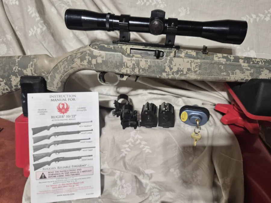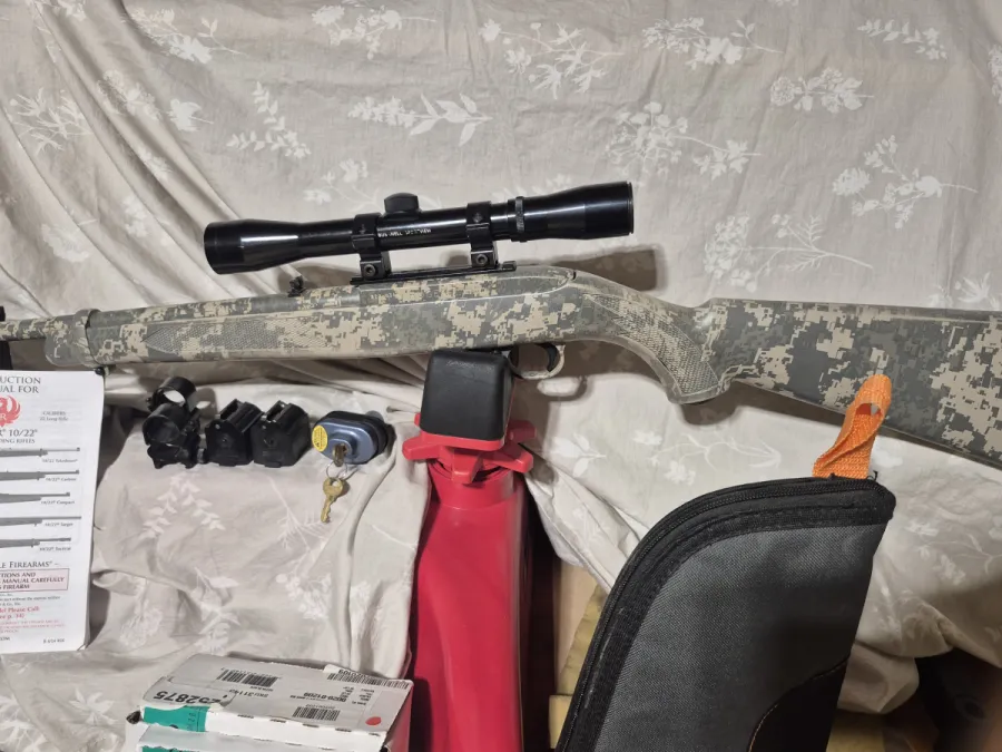 Ruger camo.200 rounds through it.Very nice condition with 2 10 shot clips. Box and soft case. Bushnell 4 power scope. 2 sets of rings.
