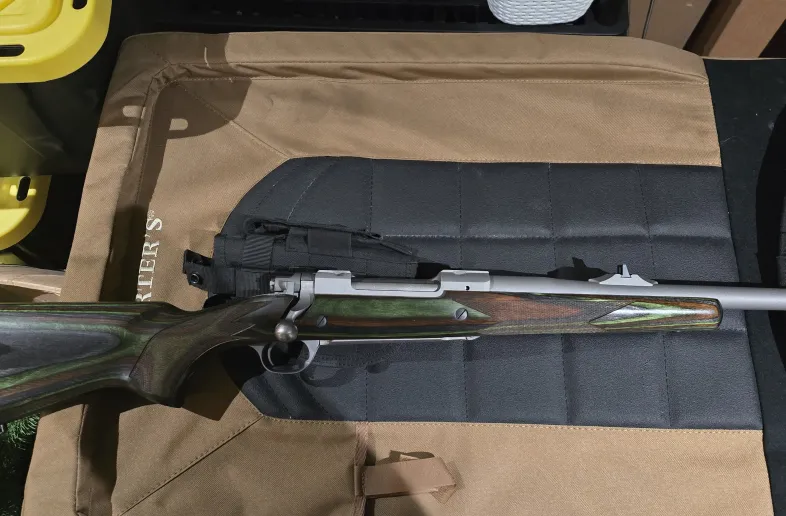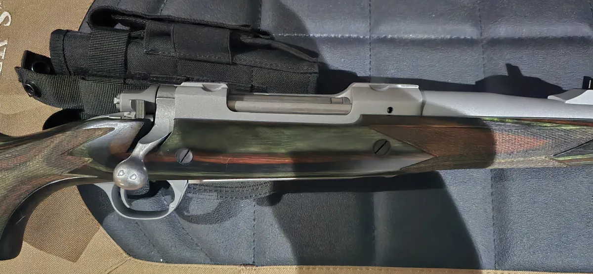 The Ruger Guide gun comes with a Green Mountain Laminate stock and is finished in Hawkeye Matte. Shooter feels significantly reduced recoil due to the removable muzzle brake system. The Ruger Guide gun also includes an adjustable V notch rear sight and a large white bead front sight for instant target acquisition.