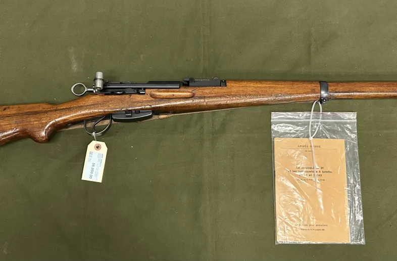 Schmidt-Rubin ZFK31/42 chambered in 7.5x55 Swiss with a 25” barrel in very good condition, integrated optic is cloudy.