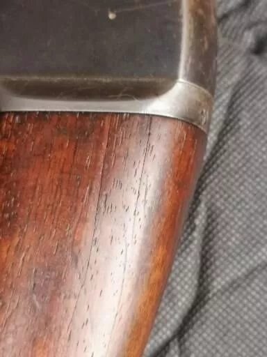 Remington model 14 1/2. WW1 issued. DCP stamped. 44-40. Shoots nicely. Action cleaned and freshly oiled. Small hairline cracks in stock and a clean glued chip repair, reduced to $955 from $1150.