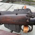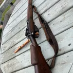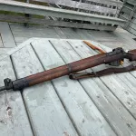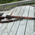 REDUCED PRICE 1943 long branch, No4 mark 1. numbers do not match, built to resemble a sniper. Butt stock has arsenal repairs and is from a genuine sniper rifle,genuine 1907 leather sling, well used. Cheek piece is a reproduction. Rear aperture sight has been removed. Third sling swivel is present. This rifle “stocks up” well with proper down pressure at the muzzle. Bore is excellent. Would be the perfect candidate for an aftermarket No32 scope kit to make this a very nice looking repro sniper with great character.