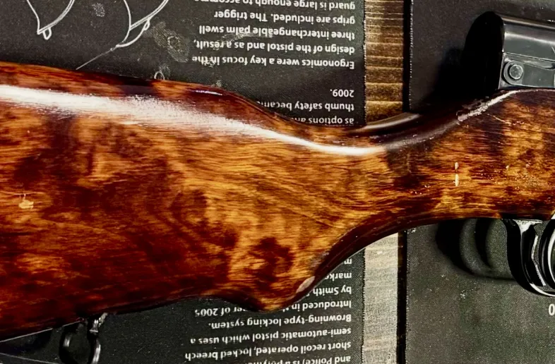 * Stock: Features a highly pronounced and attractive tiger-stripe/flame wood grain. The finish is original as-issued, currently highlighted with a thin coat of oil to showcase the figure.