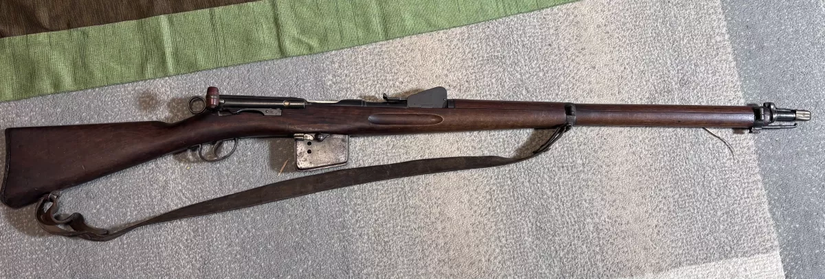 Swiss 1889 Schmidt-Rubin straight-pull rifle in overall good condition. Bore is clean with strong rifling. Wood shows honest service wear with no visible cracks. All visible serial numbers match. Swiss proofs and the unit inventory plate are present on the stock. Includes the original leather sling and the correct muzzle cap.