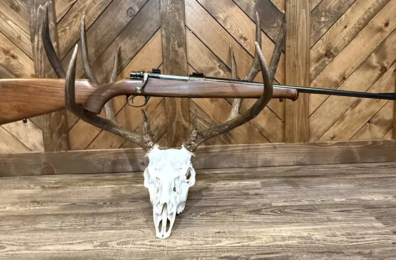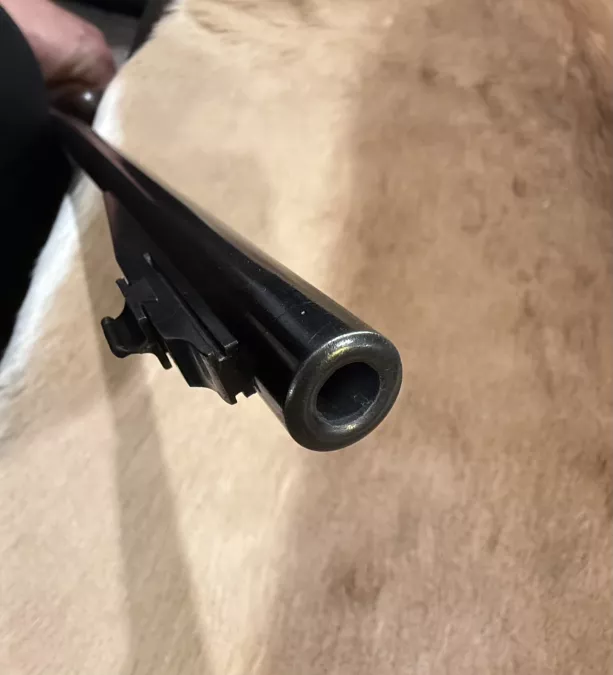 In nice shape. Shoots great. Bluing is fantastic. Comes with basses. Over all 8 out of ten. Few marks note pics.