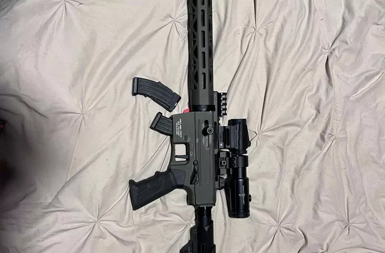 Derya tm22, M-lok front rail, vortex red dot with magnifier, oversized charging handle, 45° flip up iron sights, 2 mags, 6 months old, probably 80 rounds through it.