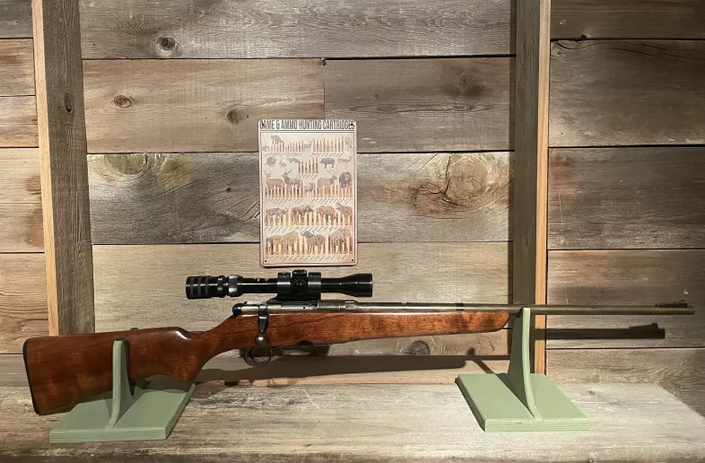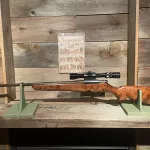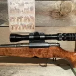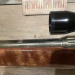 Savage 340 in 222. A previous owner refinished the stock. Rear sight is missing vintage Japanese scope mounted with weaver side mount. Blueing shows wear, more of a brown than black. The gun functions as it should.