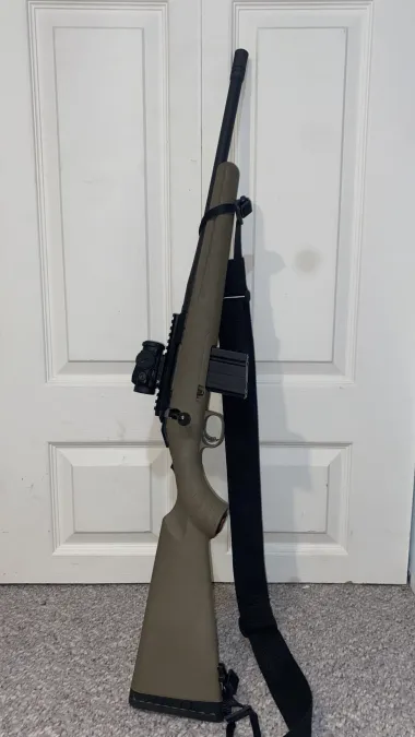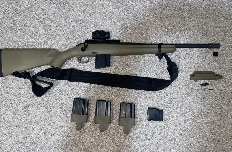 Gen 1 Ruger American Ranch in 7.62x39, magwell was converted to AR-pattern (four 10-round pistol magazines come with), though the factory Mini-30 magwell/mag is included as well.
