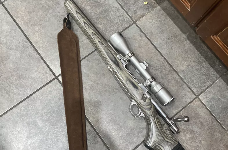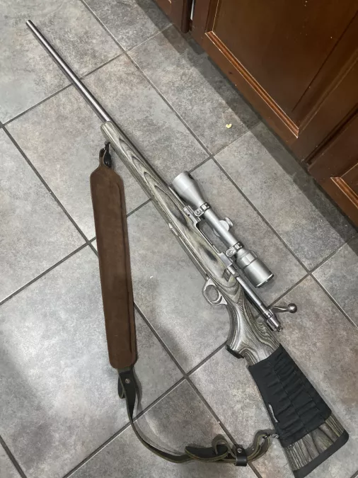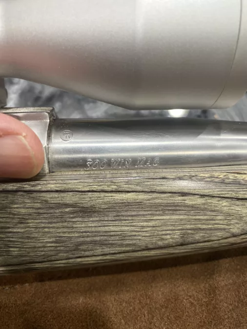 Ruger Model 77 Mark 2 left hand, stainless in 300 Winchester Magnum. Grey laminate stock, fired less than 10 rounds. Comes with 3x9 Bushnell scope and leather sling. PAL for purchase. I can ship on your dime. Also comes with 84 factory rounds. All 180 gr soft points. Winchester and Federal.