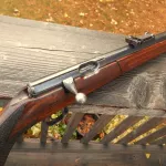 Early "deluxe" version of the Mauser ES 340 .22LR with a "duffle cut". Mauser serial number date c. 1924. British proofmarks c. 1958. Windage adjustable rear sight. Grooved for scope. Mauser Banner on Trolit buttplate, right side of butt stock and on the front receiver ring. Very nice walnut and VG bore. $550. plus shipping.