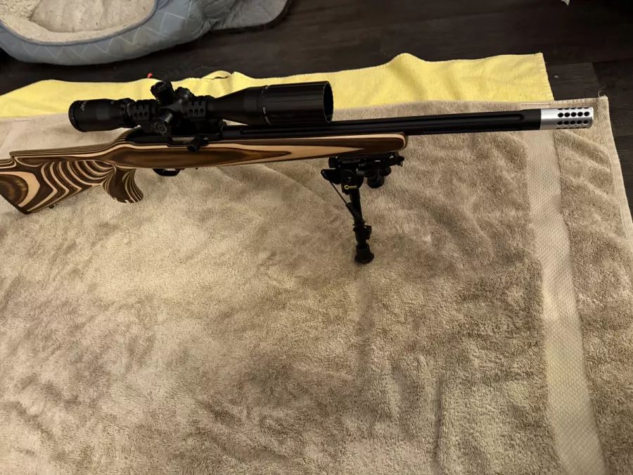 Beautiful Boyd’s thumb hole stock with recoil pad and laser grip engravings on fore end and pistol grip. Caldwell bipod. BSA 22 sweet scope 6x18 that calculates drop for you when you set yardage on scope. Fluted lightweight bull barrel with threads and ported muzzle brake. Excellent piece very accurate and light weight.