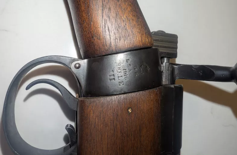 Mk. 3 Enfield. 1916 overall looks good, has the magazine cut off. It's been sitting in the safe and might like a new home to stretch her legs again.