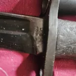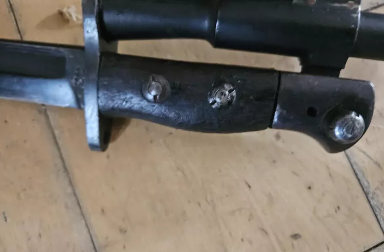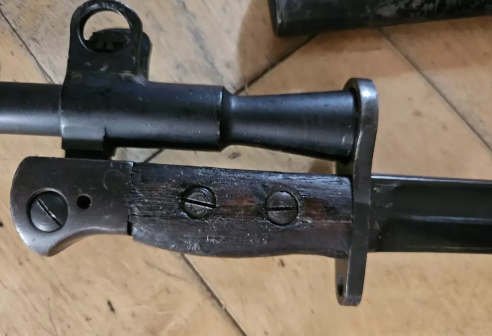 THE BAYONET HAS A MARKED WSC, WHICH IS A WAR CODE FOR WILKINSON SWORD COMPANY, WHICH MEANS IT WAS MADE DURING THE WAR. ALSO, THE BAYONET IS MARKED BY F5 ROF DATED 1943 WITH AN EARLY SCABBARD, A BROAD ARROW OVER F5 WITH A CIRCLE WITH P (POOLE).