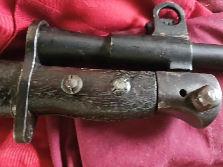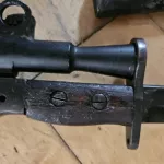 THE ORIGINAL STOVE BLACK FINISH IS 97%, AND THE BORE IS EXCELLENT, BRIGHT, SHINY, AND SHARP. THE WALNUT STOCK IS IN EXCELLENT CONDITION, BUT THERE IS A SMALL SHRINKAGE CRACK BEHIND THE RECEIVER, WHICH DOES NOT AFFECT THE PERFORMANCE OR INTEGRITY. OVERALL, IT IS A VERY NICE EXAMPLE OF A BRITISH CARBINE. IT HAS THE PROPER REAR SIGHT, AS DO ALL ORIGINAL ‘JUNGLE CARBINES.’ ALL ORIGINAL MARKINGS WERE REMOVED AT M47C. THESE FIREARM AND BAYONET COMBINATIONS ARE HIGHLY PRIZED BY COLLECTORS AND SHOOTERS ALIKE AND ARE THE FORERUNNERS OF WHAT IS CONSIDERED TO BE THE MODERN SCOUT RIFLE CONCEPT. THERE ARE SOME EXTREMELY LIGHT DINGS, SCRATCHES AND SMALL SURFACE CRACKS FROM BEING IN STORAGE FOR SOME TIME.