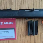 For sale: a brand new, in-box Savage left-hand 64 FLH Sporter semi-automatic rifle, chambered in .22 Long Rifle. This rifle features a 21-inch blued satin carbon steel barrel with a 1 in 16” rate of twist, ensuring excellent accuracy. It features a durable synthetic stock for balanced handling and a user-adjustable Accu-Trigger, enabling a customizable trigger pull.