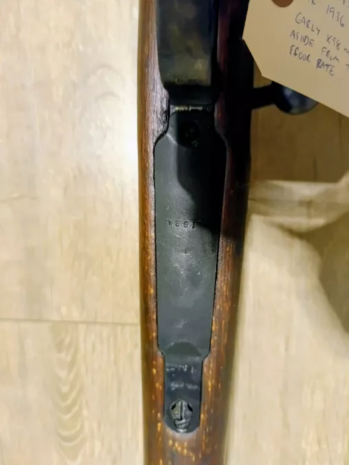 Hello I have a fairly clean example of a very early 1936 true Mauser k98. The bore has good rifling and is Shiney. Matching numbers aside from the trigger guard and floor plate. I am looking to trade for a mid to late war k98 with cupped butt plate and take down disk. My rifle does not fully match so yours does not have to either. I do expect it to have a good bore and be fully operational as mine is. Thank you for looking