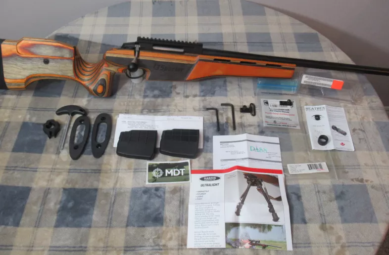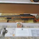 Blued finish, 23.7” barrel, threaded barrel with thread cap protector, adjustable butt (length and pitch), adjustable comb, bottom rail, adjustable set trigger, 2 magazines, spacers and tools, manuals.