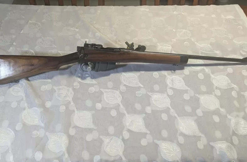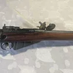 This Lee-Enfield No. 1 Mk 4 .303 is a sporterized military bolt-action rifle that was originally produced in the United States by the Savage-Stevens plant in Massachusetts and are marked "U.S. PROPERTY". It is chambered in .303 British with a 10-round detachable magazine and a collapsible rear peep sight. It is dated 1943.