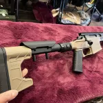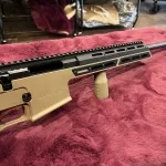 Finished in Flat Dark Earth (FDE), the lightweight aluminum chassis integrates M-LOK slots along the forend and a full-length top Picatinny rail, allowing for easy mounting of optics and accessories. It comes equipped with an MDT adjustable folding stock for compact transport and customizable length of pull and cheek height, along with ergonomic AR-style pistol and vertical grips for improved handling.