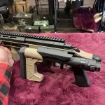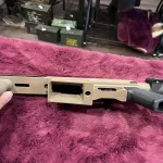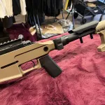 Finished in Flat Dark Earth (FDE), the lightweight aluminum chassis integrates M-LOK slots along the forend and a full-length top Picatinny rail, allowing for easy mounting of optics and accessories. It comes equipped with an MDT adjustable folding stock for compact transport and customizable length of pull and cheek height, along with ergonomic AR-style pistol and vertical grips for improved handling.