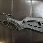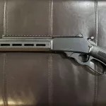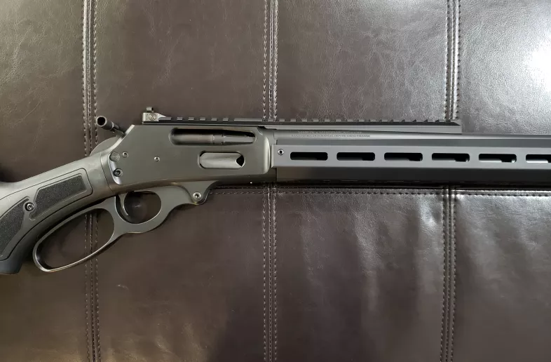 For sale is a brand new (never fired) Ruger-made Marlin Model 336 'Dark Series' lever-action rifle in .30-30 Win. This model has an M-Lok handguard with QD mounts. It also has an M-Lok stock with cheek riser. It comes with a medium-sized loop lever, and a hammer extention has been installed. It has a full-length 'scout/lever' picatinny rail w/ integrated ghost ring iron sight (adjustable) & green fiber optic front sight. In addition, a radial muzzle brake has been added (for reduced recoil) from the factory. This rifle is in excellent plus condition with not a single round through it!
