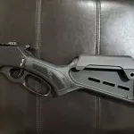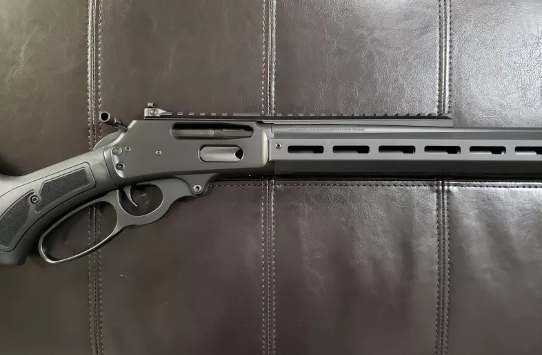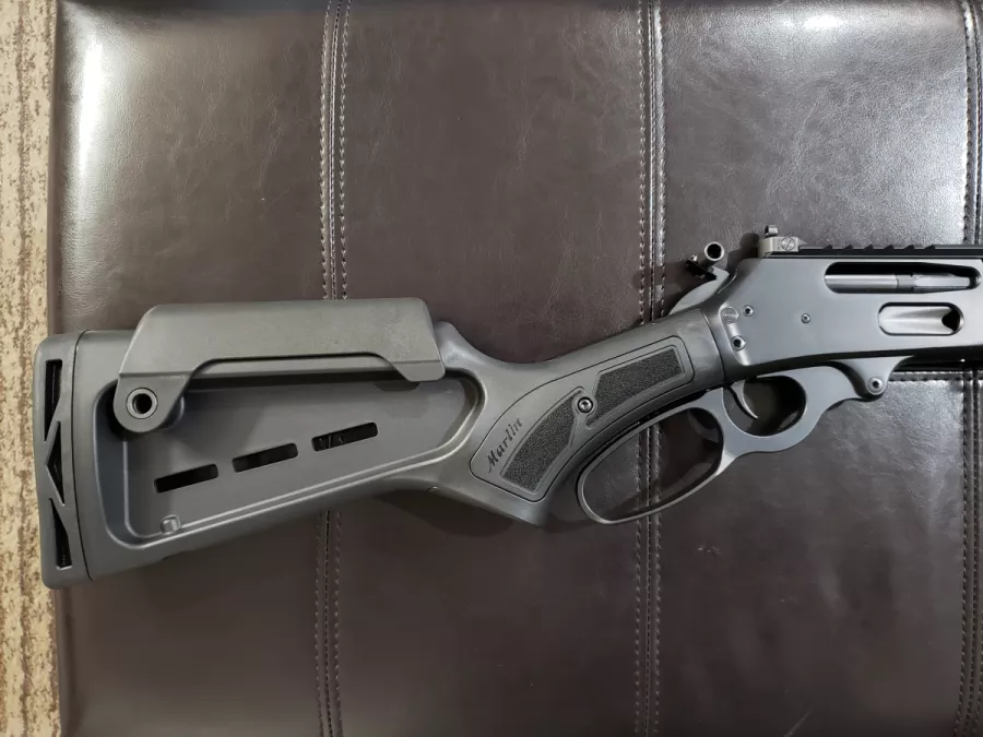 For sale is a brand new, never fired, Ruger-made Marlin Model 336 'Dark Series' lever-action rifle in .30-30 Win. This model has an M-Lok handguard with QD mounts. It also has an M-Lok stock with cheek riser. It comes with a medium-loop lever, and a hammer extention is installed. It has a full-length 'scout/lever' picatinny rail w/ integrated ghost ring iron sight (adjustable) & green fiber optic front sight. In addition, a radial muzzle brake has been added (for reduced recoil) from the factory. This rifle is in excellent plus condition with not a single round through it!