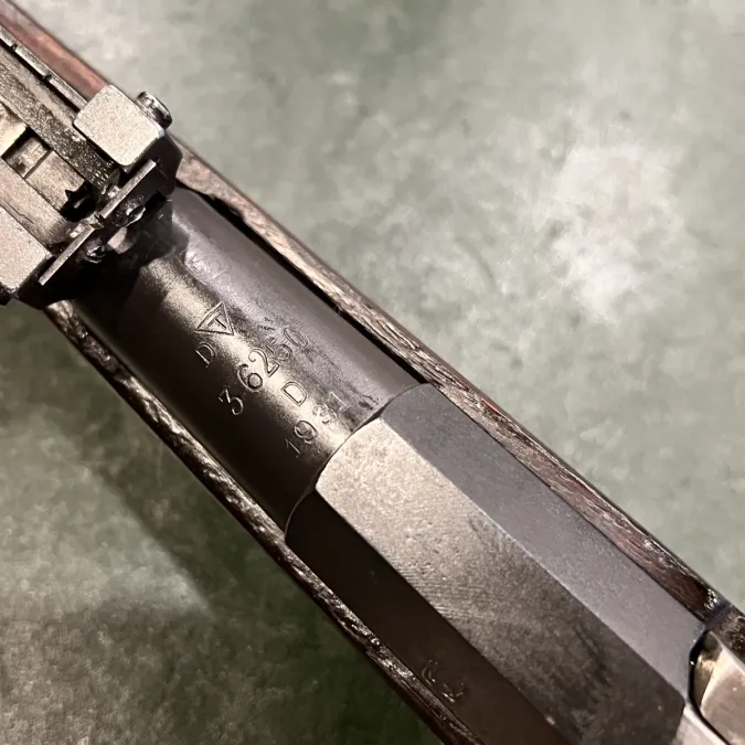 This is a rare Finnish M27 “Pystykorva” rifle, manufactured by Tikkakoski in 1931. Chambered in 7.62×54R and featuring the “D” marking for the upgraded D166 cartridge, this rifle retains its original serial number on both receiver and bolt (No. 36***). The bore remains exceptionally bright with strong rifling. The rifle displays the classic dog-ear front sight and early reinforced barrel bands typical of the M27 series. Approximately 55,000 were produced, making this early Tikka example a highly sought-after collector’s piece in remarkable condition.