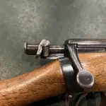 This carbine bears both a Canadian Broad Arrow (C↟) on the wrist band and a British Broad Arrow on the trigger guard—evidence of initial British government ownership and subsequent Canadian military service. Such dual acceptance marks confirm its cross-service history between Britain and Canada.
