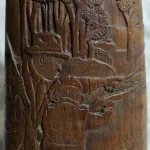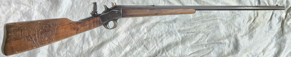 Beautifully antique carved buttstock on one side, depicting a father teaching his son to hunt rabbits with a Model 4, in early 1900's dress.