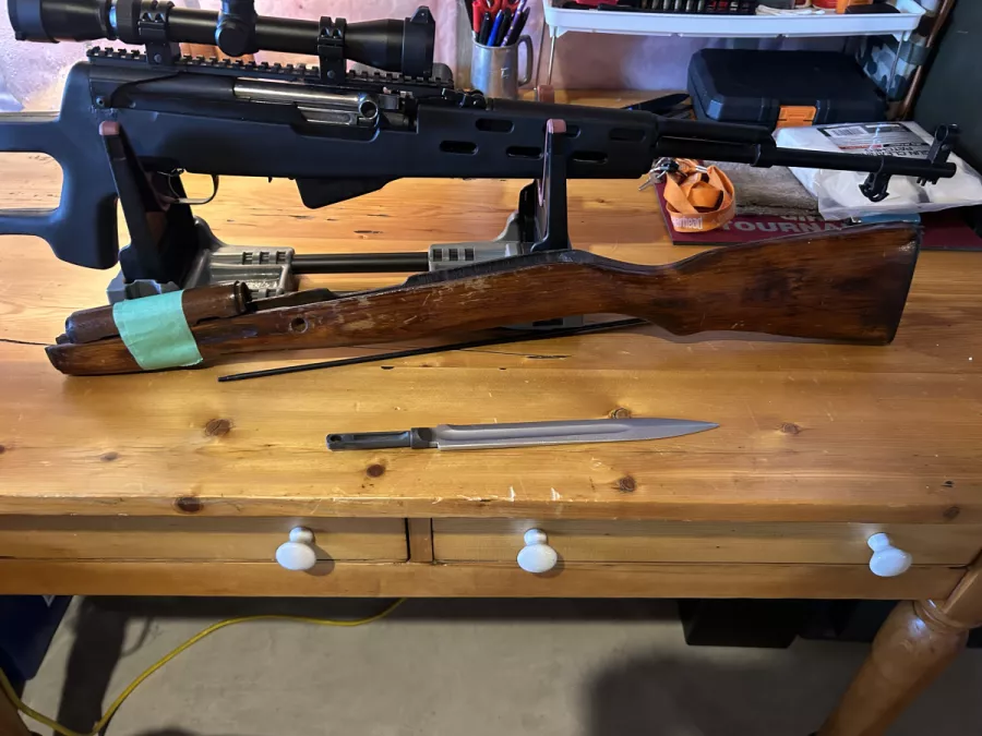Original stock and hardware, sight, bayonet, cleaning rod and tool kit.