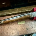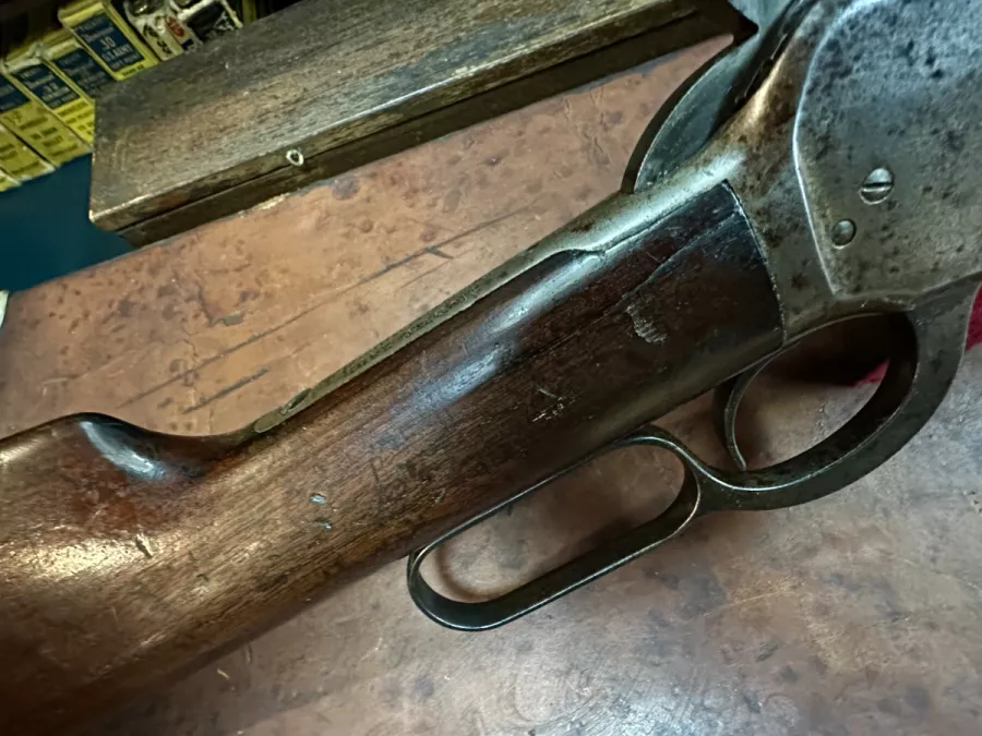This rifle sports a magnificent bore, bright and shiny with good crisp rifling, no dark spots or pitting present. Mechanically it is in excellent condition and should shoot like intended. The metal finish is all but disappeared, with the exception of the mag which is quite good and some areas on the barrel holding some blue. The wood appears original, front and back are good and solid without any extra holes, however there are 2 small cracks on either side of the wrist area on the butt stock. Date of manufacture 1916. If you have been looking for a great shooter in 44-40 this is the one.