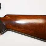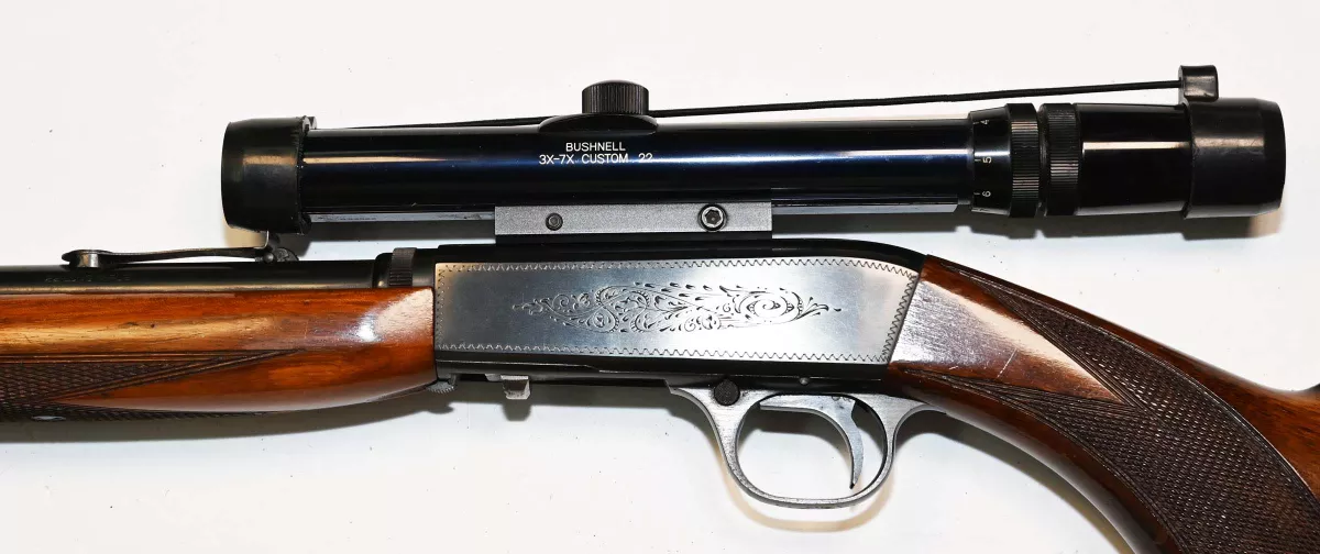 GORGEOUS EARLY BROWNING SEMI-AUTO 22 WITH WHEEL SIGHT. First introduced in 1956, these fine semi-auto 22 rifles are precisely made and still in demand. This gun was made in 1959 and the serial number, T54073, is stamped on the metal magazine stop plate inlet into the rear of the butt stock, which was the practice in 1958 to 1960. An assembly number, T59944, is stamped on the front of both receiver and trigger assembly and another assembly number, 79, is stamped on the inside top of the butt plate and written in yellow crayon on the rear of the butt stock. The distinctive 4-step wheel adjustment rear sight, referred to as the "Wheel Sight", was only used until 1960 and is a sought after feature. A 4 power Bushnell 22 sight is mounted using a Browning base.