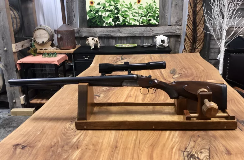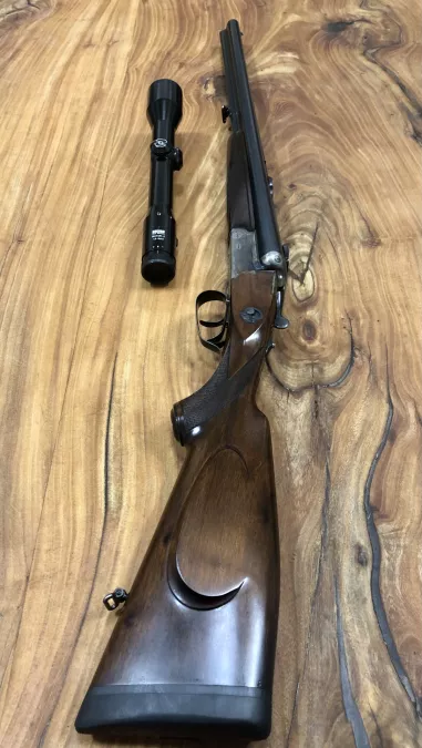 Merkel Drilling Rifle 2x12 gauge over 8x57JRS with detachable Zeiss scope.