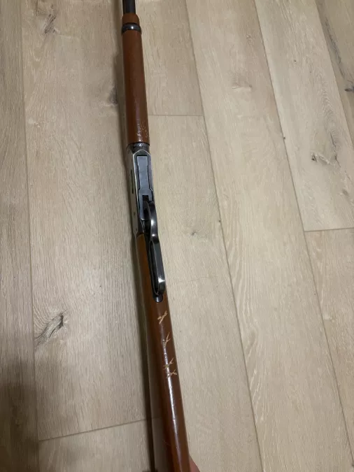 Post 64 Winchester model 94 30/30, stock was painted and X’s carved in bottom, sights painted white, gun in good hunting condition, 650$ No shipping