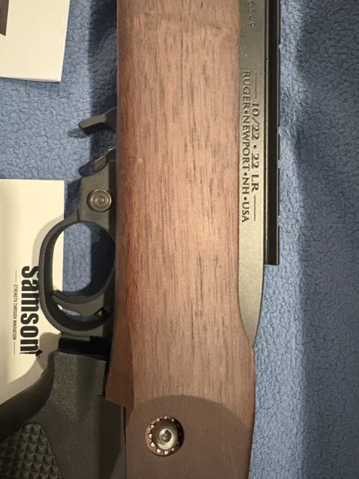 For sale is an unfired 18” Ruger 10/22 with Samson stainless stock. Authentic walnut and stainless steel Samson stock (been sold out for months). Small dent/scratches below ejection port on the wood from storing with the included Ruger lock…may be able to be steamed out.