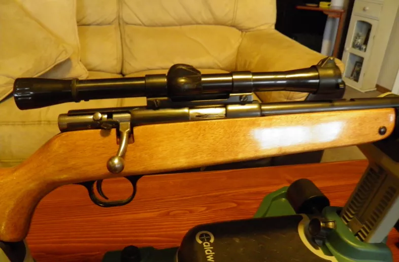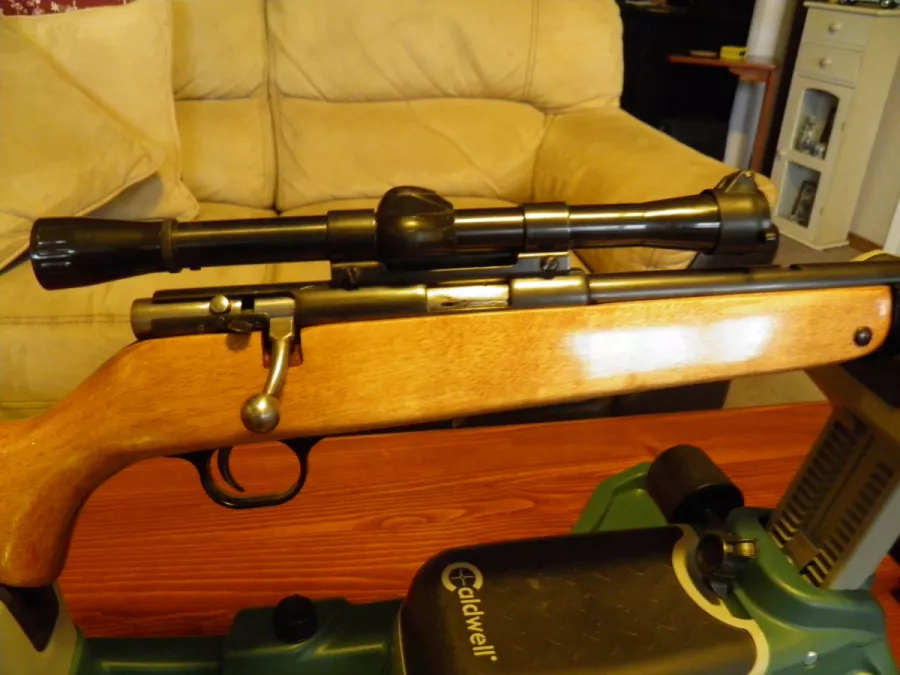 22 LR BOLT ACTION REPEATER W/10 SHOT MAGAZINE (NOT SHOWN BUT INCLUDED). WOOD REFINISHED WITH HAND RUBBED OIL FINISH. SCOPE INCLUDED BUT IS NOT SIGHTED IN. NO REAR SIGHT. FRONT END OF STOCK FOLDS DOWN TO GRIP IF DESIRED. (SEE PHOTO 3)
