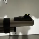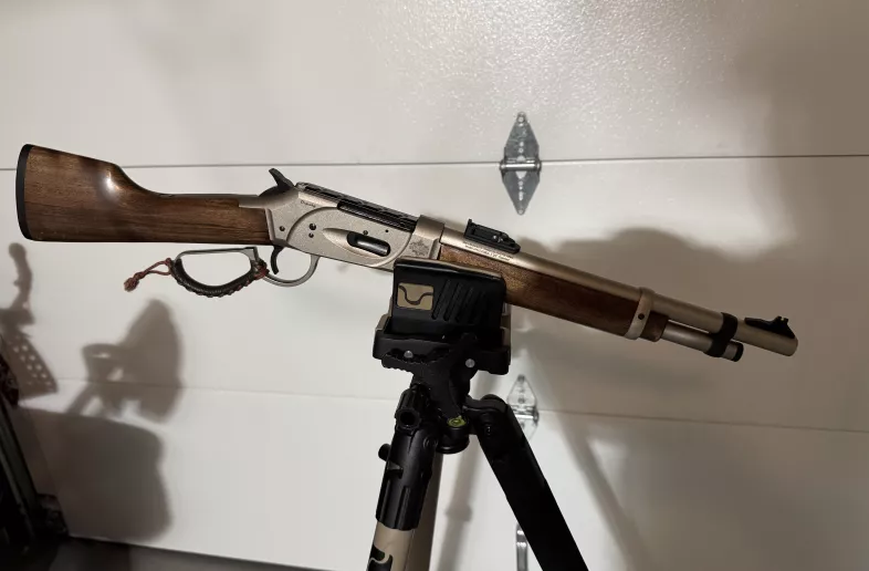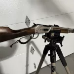 Beautiful stainless finish with walnut furniture. Smooth action, short barrel, and a big loop lever wrapped with leather for grip. Very fun little gun and cycles great — just not getting used.