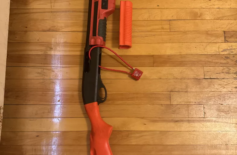 It can still fire regular ammunition, but it’s orange so a police officer can tell the difference at a glance between a weapon loaded with lethal ammo (00 buck or slug) and one loaded with less lethal ammo such as beanbags, rubber buck, or rubber slugs.