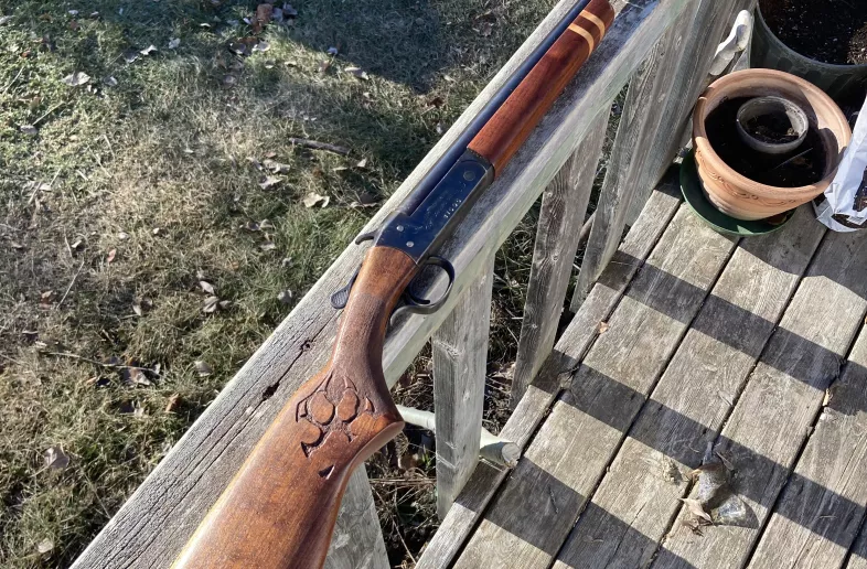 Neat looking Cooey 84 with an engraving on the stock. Doesn’t have the original butt plate so comes with a slip on recoil pad.