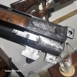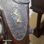 Carl started this company in Munich in 1854 and earned the reputation for producing the highest quality firearms but was taken over by RWS in 1927. This gun was imported by Simson & Co. Barrels were made in Suhl. This appears to be a presentation model or grade. Beautiful scroll engraving on top barrel breech with blued barrels and full vent rib. Majority of un-finished metal is jeweled. Rib has maker legend in gold with The Simson and Suhl also in gold. The side lock receiver features full coverage, very finely executed scroll engraving, case color, with two gold inlay ducks in flight on left side and pheasants on right, both set in a vignette oval. The trigger guard is also fully engraved with two gold geese at base and gold inlay. Simson in script at base of receiver. Gun sports a single Miller trigger. The walnut straight grip stock is finely checkered. The matching forearm features the same decoration. LOP 14 1/4 The lines per inch checkering is very fine and appears to be about 30. CONDITION: Excellent. Barrels retain 90% blue with scattered wear and handling marks. Bores are bright. Lock up is tight. Wood is superb with minor impressions. Case colors are there but muted. Cannot image what the cost would be to replicate the quality and finish of this gun today.