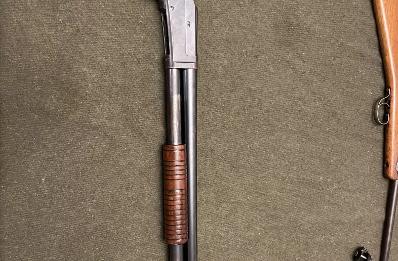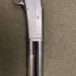 Marlin Model 17G, clearly marked 12 GA on the barrel. Pump action with tubular magazine, grooved wooden fore-end and matching wooden buttstock. Metal finish shows wear and handling marks; wood is solid with normal dings and age-checking (see photos). Receiver, fore-end and magazine components present — action appears complete and the slide cycles smoothly by hand, but I have not test-fired it