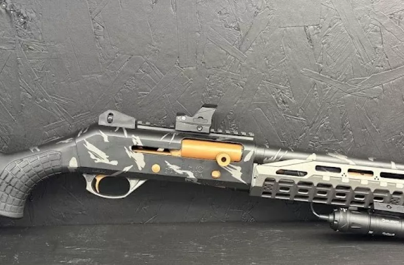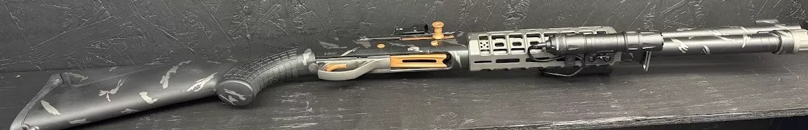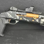 Canuck operator with upgrades. Handguard Strike industries Hayl rail, original handguard, extra buttstock ( like beretta1301) , enhance charging handle (s&J), custom unique cerakote job( Tungsten-Graphite black camo with Copper accent), powerfull olight ODIN S 1500 lumen flashlight. Very nice red dot( VOTATU PMD504), match saver. . John wick style shotgun!!💥💥💥💥 Semi-auto 12 gauge shotgun.