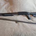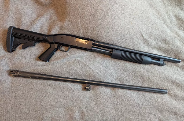 Maverick 88 with 18" bead sight barrel, 30" bead sight barrel and an ATI pistol grip with removable AR style adjustable stock.